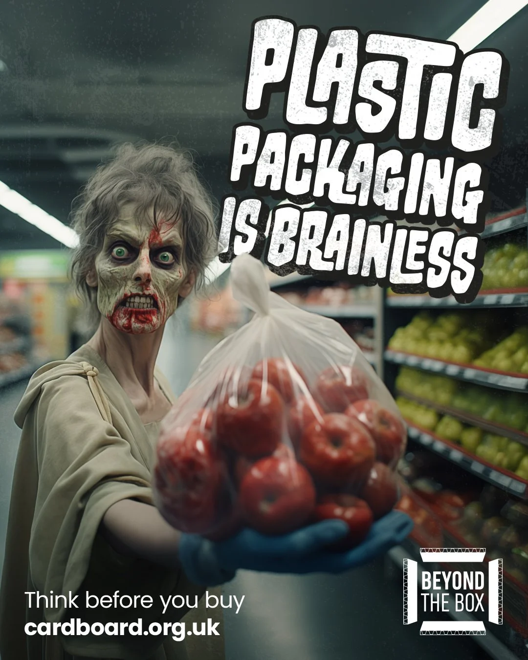 Thoughtless food companies still use plastic packaging. For Beyond the Box at Halloween, we reminded people to think before they buy.